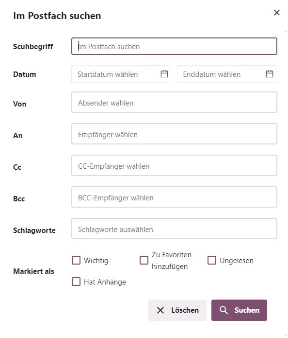 Auf der rechten Seite findest du den “Filter-Button” für diverse Suchfunktionen in deinen Postfächern. Wenn du vorab schon in der linken Postfachleiste das vermutete Mail-Konto oder noch konkreter Postfach auswählst, werden deine Filter-Kriterien auf den Bereich angewendet.