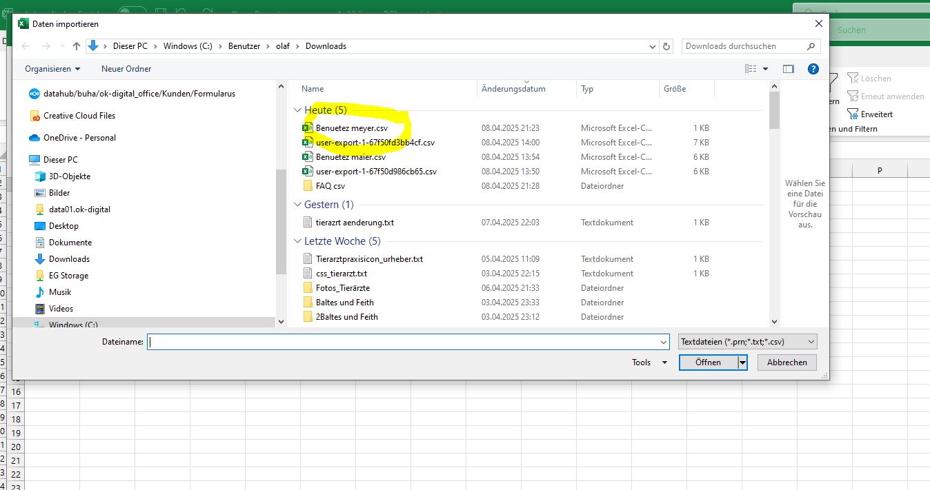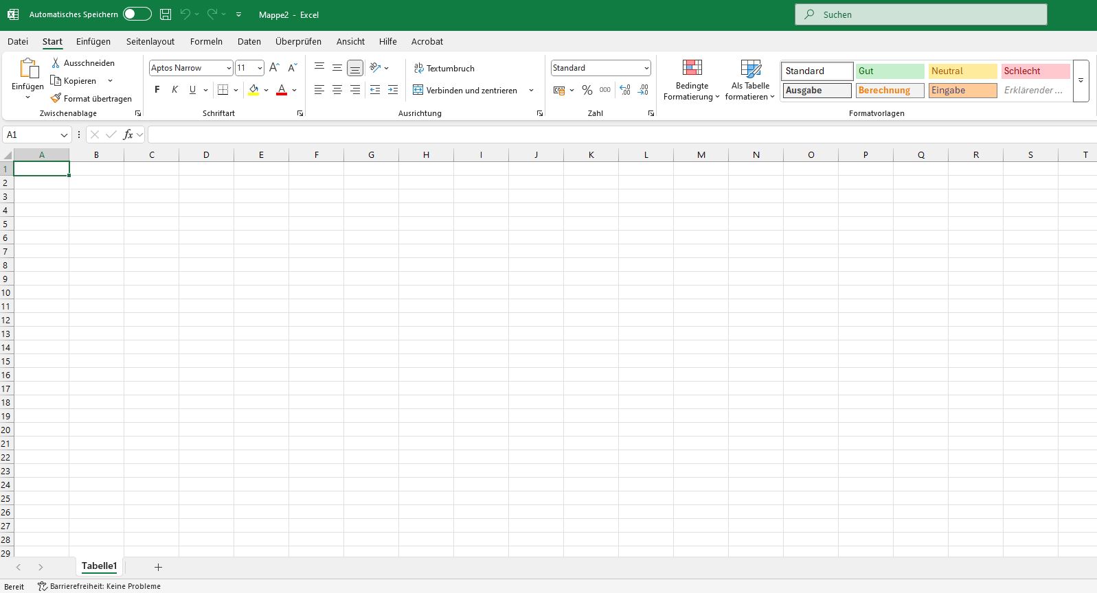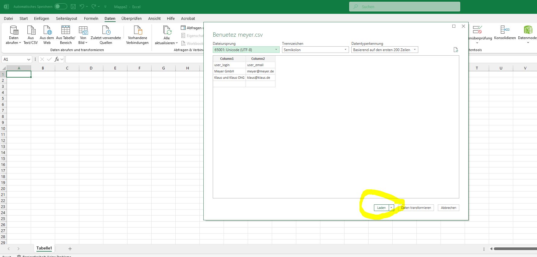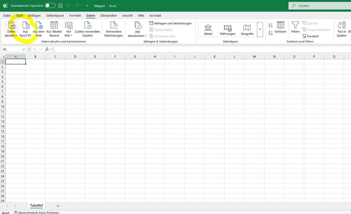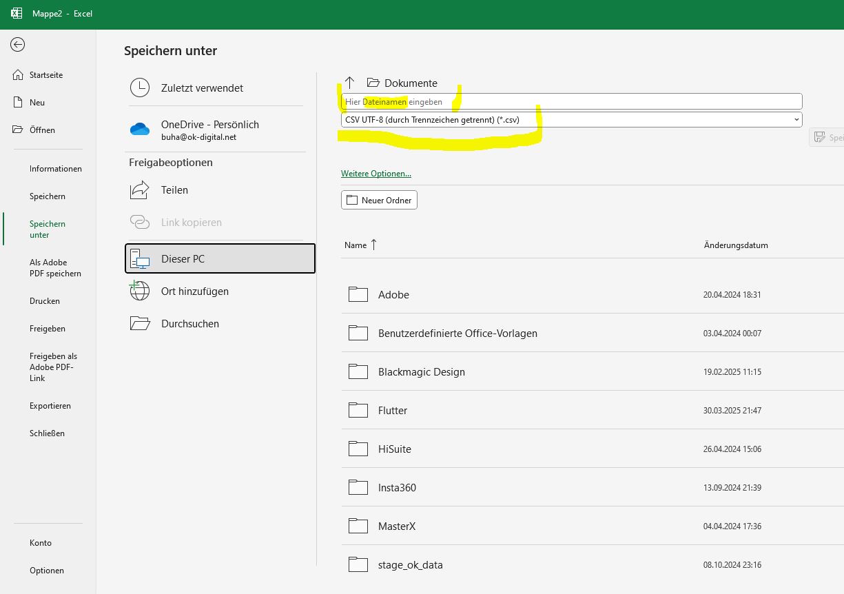 Alle Tabellen bis auf die eine aktive löschen. CSV Dateien können keine Tabellenblätter haben. Nach einfüllen der Daten, unter Start – speichern unter wählen und dort das Format csv auswählen. Ort und Namen wählen. Fertig