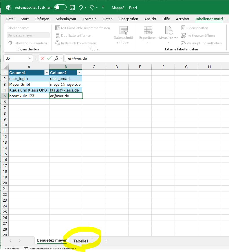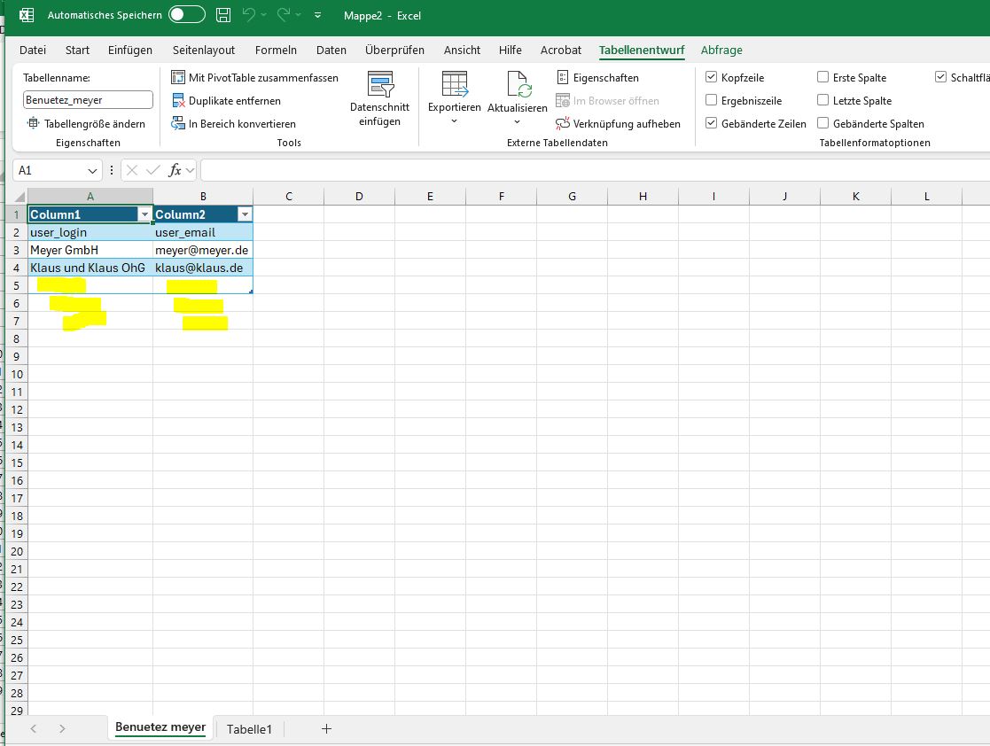 2 Testeinträge sind vorhanden- 1. Spalte Benutzername 2. Spalte e-mail adresse